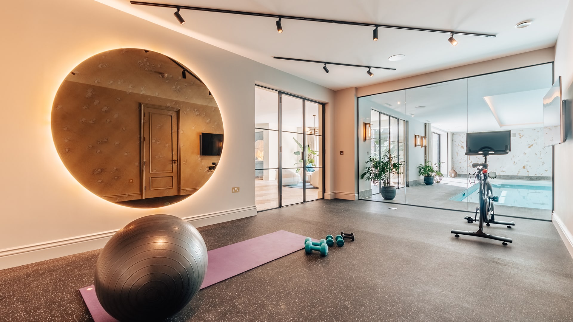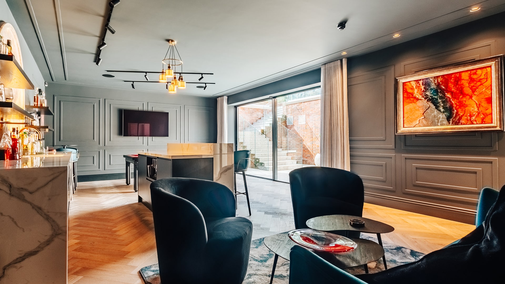 Our deliverables: A full centralised lighting and audiovisual system throughout with automated curtains and blinds, one touch activation of rooms for music and lights with a basement family cinema room.